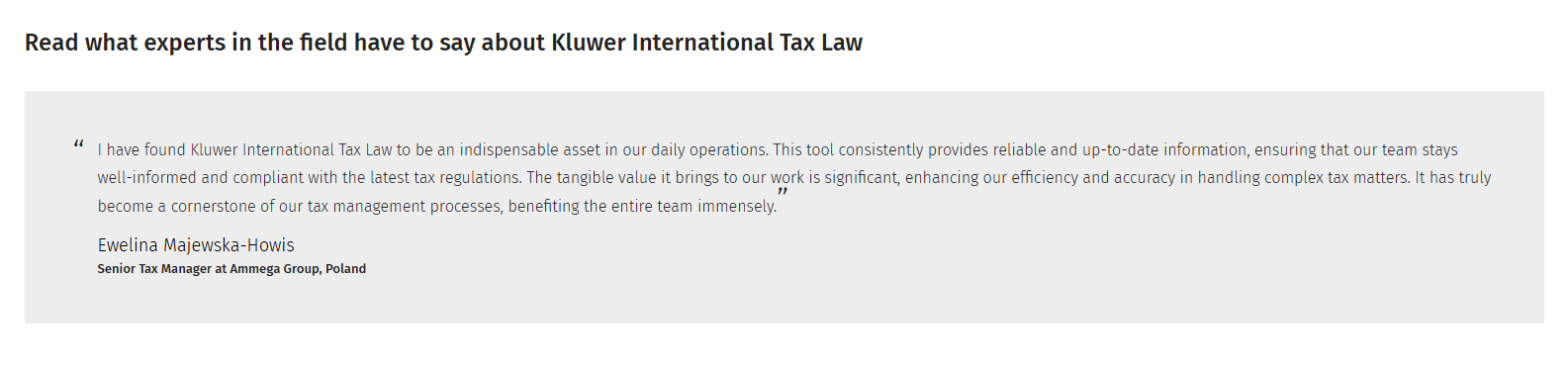 Kluwer International Tax Law is supporting tax law professionals through rich insights presented via a wide range of research sources providing deep domain knowledge on cross-border tax topics.VitalLaw Expert AI helps you to save time by delivering key insights faster, reducing the burden of repetitive research tasks. It allows you to work confidently under pressure, freeing up time to focus on delivering strategic insights to stakeholders.