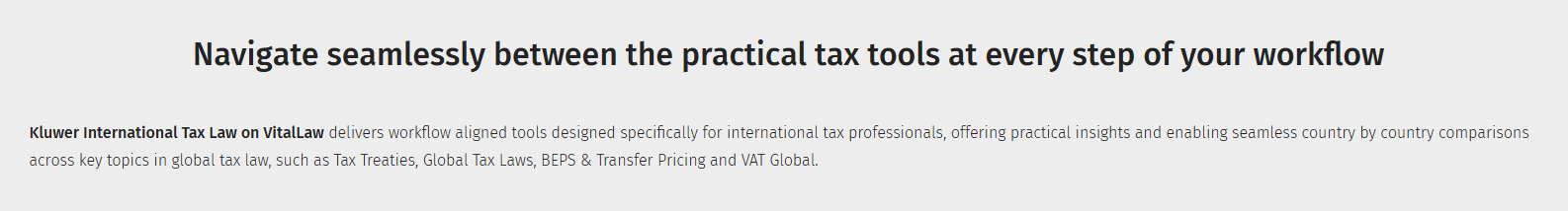 Kluwer International Tax Law on VitalLaw delivers the definitive guidance, practical tools, and expert analysis you need, whether you advise clients at a law firm or navigate complex matters in-house, to make strategic decisions with precision. The legal research platform provides authoritative insights on key areas including Permanent Establishment (PE+), double tax treaties, global VAT, and the OECD’s BEPS framework.With VitalLaw Expert AI, you can access the right answer faster than ever. This conversational AI tool empowers your research process with AI-assisted search, summarization, practical content creation, and chat capabilities. The extended workflow increases productivity, helping you make informed decisions efficiently.